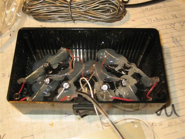 Die LEDs sind hier bereits präpariert, d.h. an einer Seite mit dem jeweiligen Widerstand verlötet. Die Wirderstände ergeben sich aus Batteriespannung 4x1,5V=6V, bei 3,1V der LED muss der Widerstand jeweils 2,9V vernichten, ergibt (bei 20mA) 2,9V geteilt durch 0,02A = 145Ω. Der nächsthöhere Normwiderstand ist 150Ω. Zwar liegt die Spannung frischer Batterien teilweise über 1,6V (ALDI), fällt dann aber schnell ab, so dass dieser Widerstand ein guter Durchschnitt auch für schwächere Baterien ist. Die LEDs wurden jezt alle parallel, je nach Elektrode, verkabelt, in die Fassungen eingesetzt, und die Beinchen (um Platz für das Batteriefach zu machen) auf den "Boden" bzw an die Seitenwand gebogen.