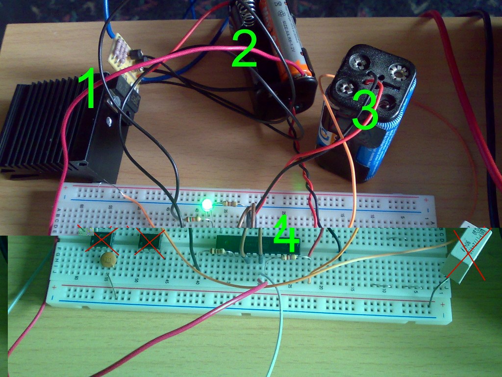 Bei 4 schließlich das Steckbrett mit Atmega und etwas Beschaltung. Unter anderem eine grüne LED, die im Reflexlade-Takt blinkt und bei Ladeende erlischt. Die beiden anderen ICs und der Kondi haben keine Bedeutung in der Schaltung, deshalb hab ich sie mal durchgestrichen.