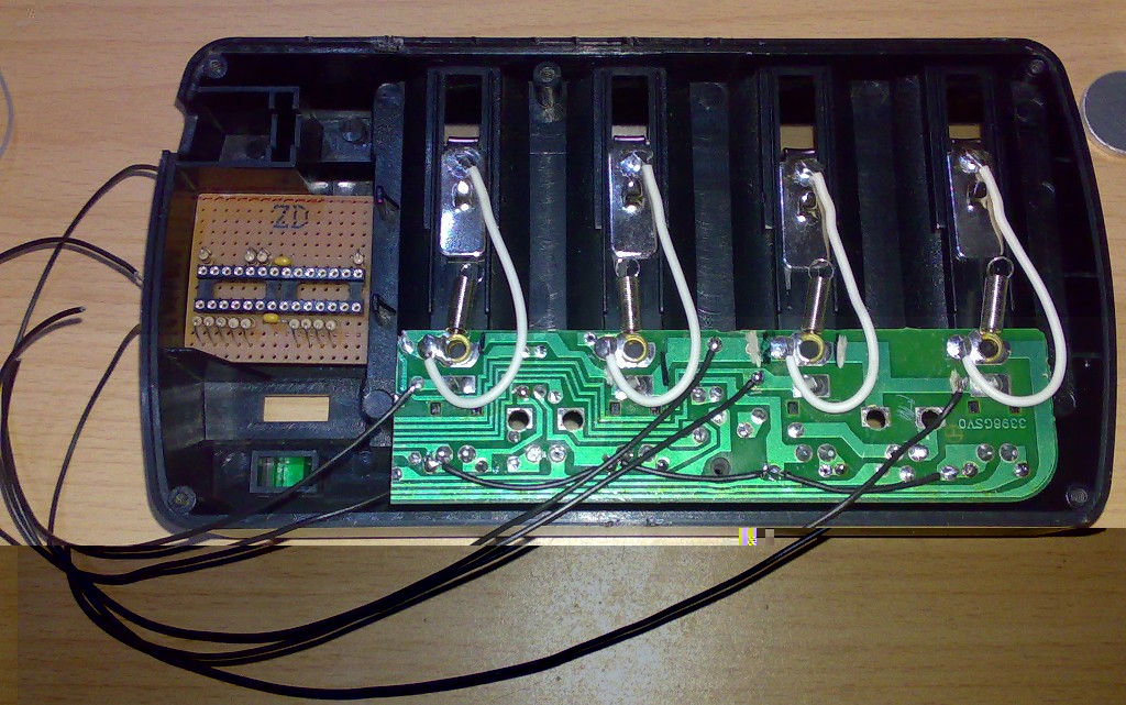 Und noch ein Bild von unten. Die grüne Platine ging mal bis links um die Ecke. Dort war noch der Trafo drauf. Habe ich aber abgesägt, sodass nur noch der Teil an den Ladeschächten über blieb. Anstelle des Trafos sitzt dort schon die neue Platine für den Atmega. Als Netzteil gibts dann ein Steckernetzteil, weil im Ladegerät kein Platz mehr ist. An den Ladeschächten habe ich noch 4 Stück weiße Silikon-Litze als Brücke angelötet, da der Ladestrom vorher nur über die Federn übertragen wurde. Jetzt bei max. 1,4A hätte man aber sicher nicht mehr lange Freude an der Federkraft :mrgreen: .