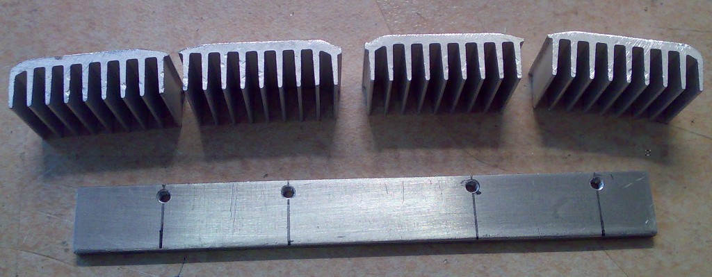 Dazu habe ich ein 3mm Alu-Blech angefertigt, wo die FETs der 4 KSQs elektrisch isoliert aufgeschraubt werden. Später werden dann von außen die kleinen Kühlkörper angebracht.