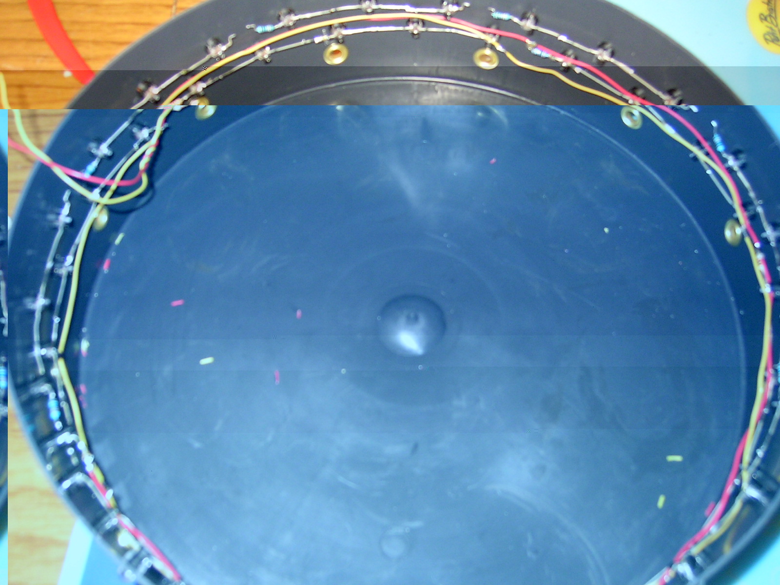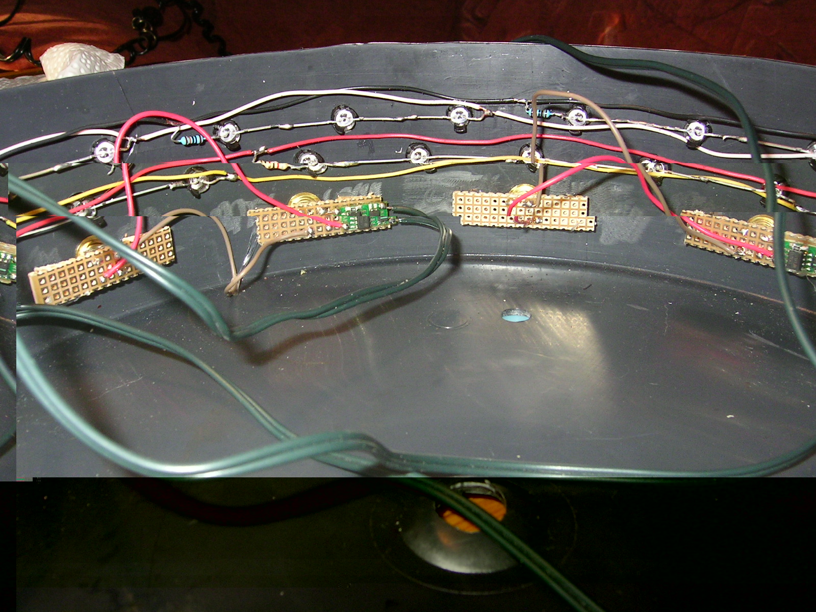 Im oberen Ring habe ich 24 Blaue 5mm LED 3,2V/20mA zu je 3 in Reihe mit jeweils einen 130 Ohm Widerstand angeschlossen:3x3,2V=9,6V-12V=2,4V:20mA=120 Ohm
