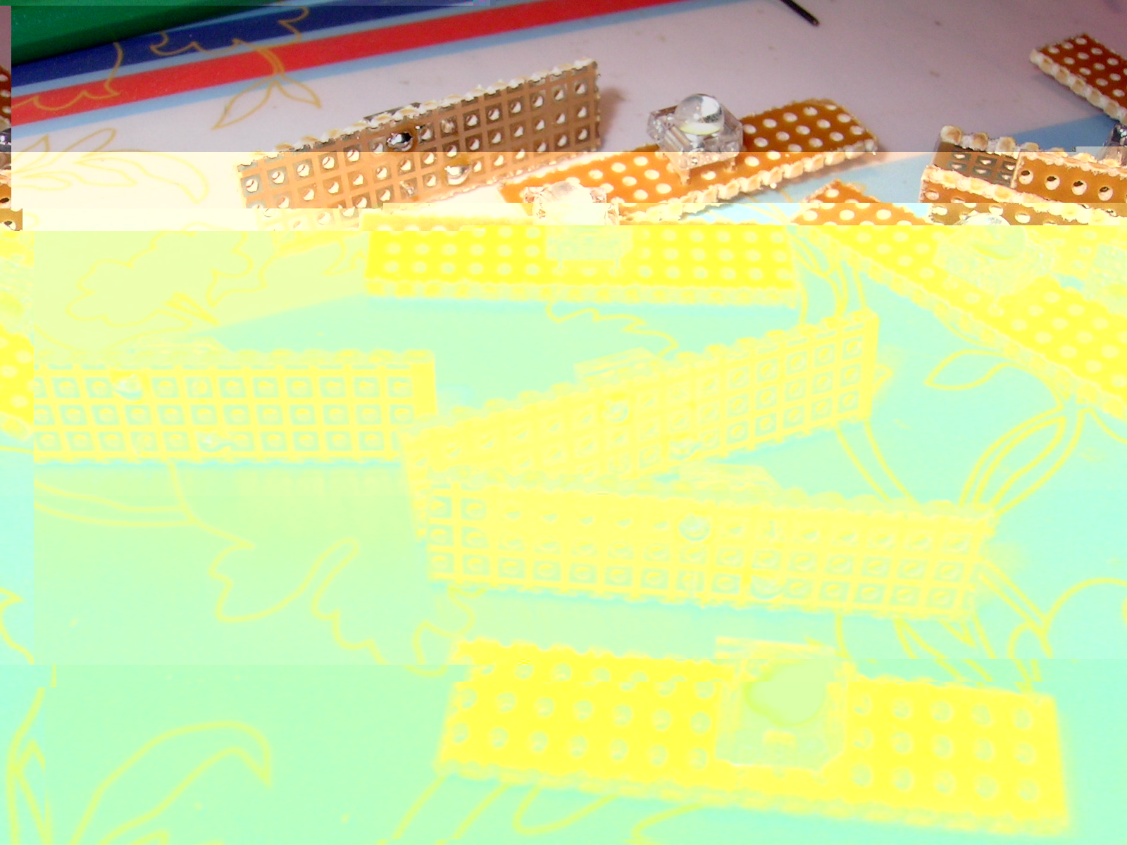 Um diese zu befestigen habe eine Lochrasterplatine in 12 1,2cm breite und 5cm lange streifen gesägt und die Suflus mittig an 2 der 4 Beinchen angelötet. Danach auf 6 Streifen eine 80mA KSQ geklebt und jeweils ein Streifen mit KSQ und einen ohne in Reihe mit Kabel verbunden:2 Suflus a 3,2V = 6,4V + Dropspannung der KSQ 3,3V = 9,7V also ausreichend für ein NT 12V/800mA