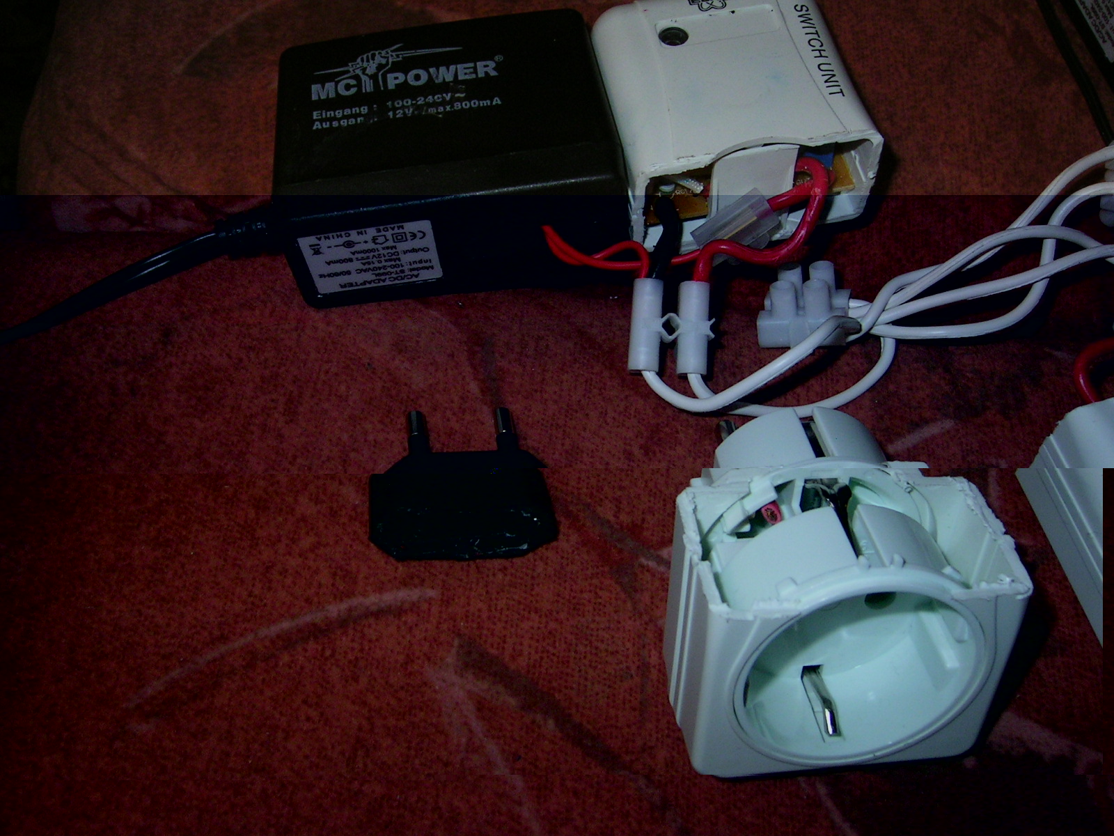 Nun noch die losen Kabel verbinden: vom Funkstecker das lange rote und das schwarze Kabel sind für den Eingang (220V vorsicht)zuständig. Das kurze rote liegt hinter dem Schalter.(verzeit mir bitte meine unfachlichen Ausführungen) Also kurz gesagt lang rot und schwarz+einmal rot vom NT an Spannungsquelle 220V.Kurz rot mit dem zweiten Kabel vom NT verbunden. Ist noch alles klar? Foto klärt auf.