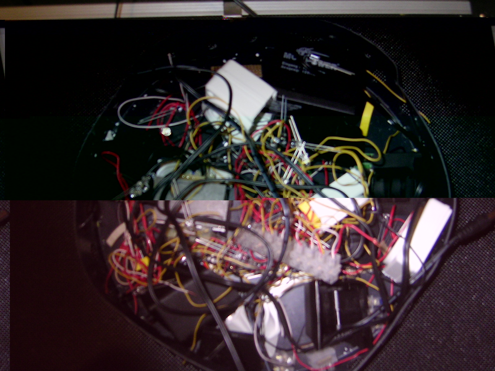 EDIT: Das Bild zeigt allerdings bei genauem betrachten NICHT die Lampe :wink: man kann einen Streifen lüstenklemmen seh, der so nirgends in der Lame verbaut war, auserdem sind die Weisen Teile das was er von den Funksteckdosenabgesägt hatte auch die ganze Lize war nirgends in der Lampe zu sehen. ich vermute er hat den schreibtisch aufgeräumt und alle in einen schwarzen behälter getan der zufällig gaaanz grob so ähnlcihe Löcher in den seiten hatte und ein bild davon gemacht.