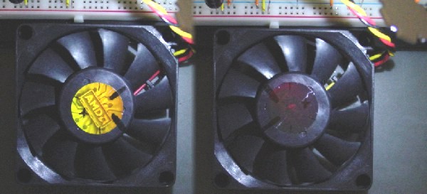 Dann hab ich dem Lüfter mal die vollen 12V verpasst, die LED lief dabei ohne Widerstand auf ca 25mA.