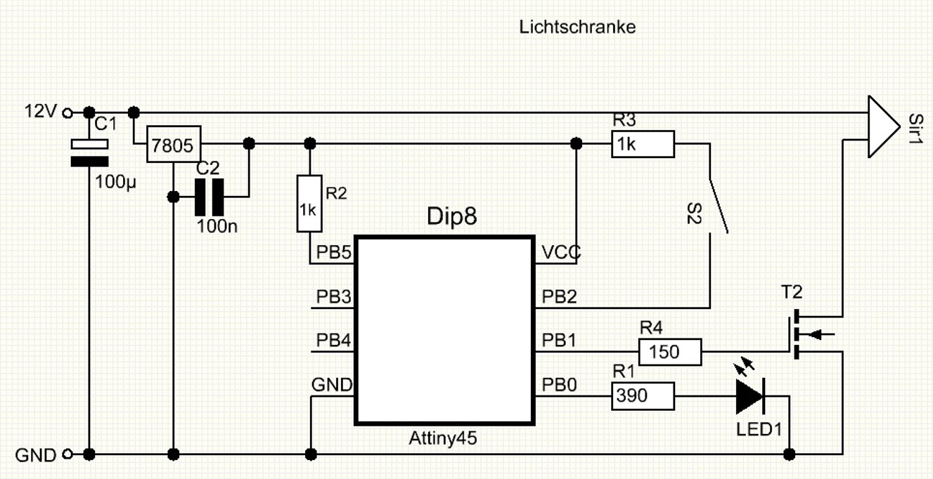 -Da die Lichtschranke ein Relais-Ausgang hat, muss man nicht den Umweg über einen Transistor machen, sondern kann direkt von 5V auf den Eingang schalten.
