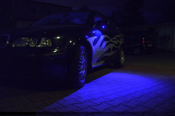Fußraumbeleuchtung mit 20 x Superflux: Handschuhfach mit 6 x Superflux: Endstufenbeleuchtung mit einer pulsierenden 1Watt Luxeon: Kofferraumbeleuchtung mit 10 x Superflux: Türgriffmulde mit je einer 5mm LED: Weitere Umbauten vielleicht nächste Woche.