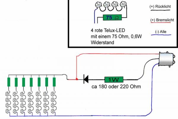 Den Dimm-Widerstand für das Rücklicht würde ich mit ca 180 - 220 Ohm dimensionieren. Einfach ausprobieren!