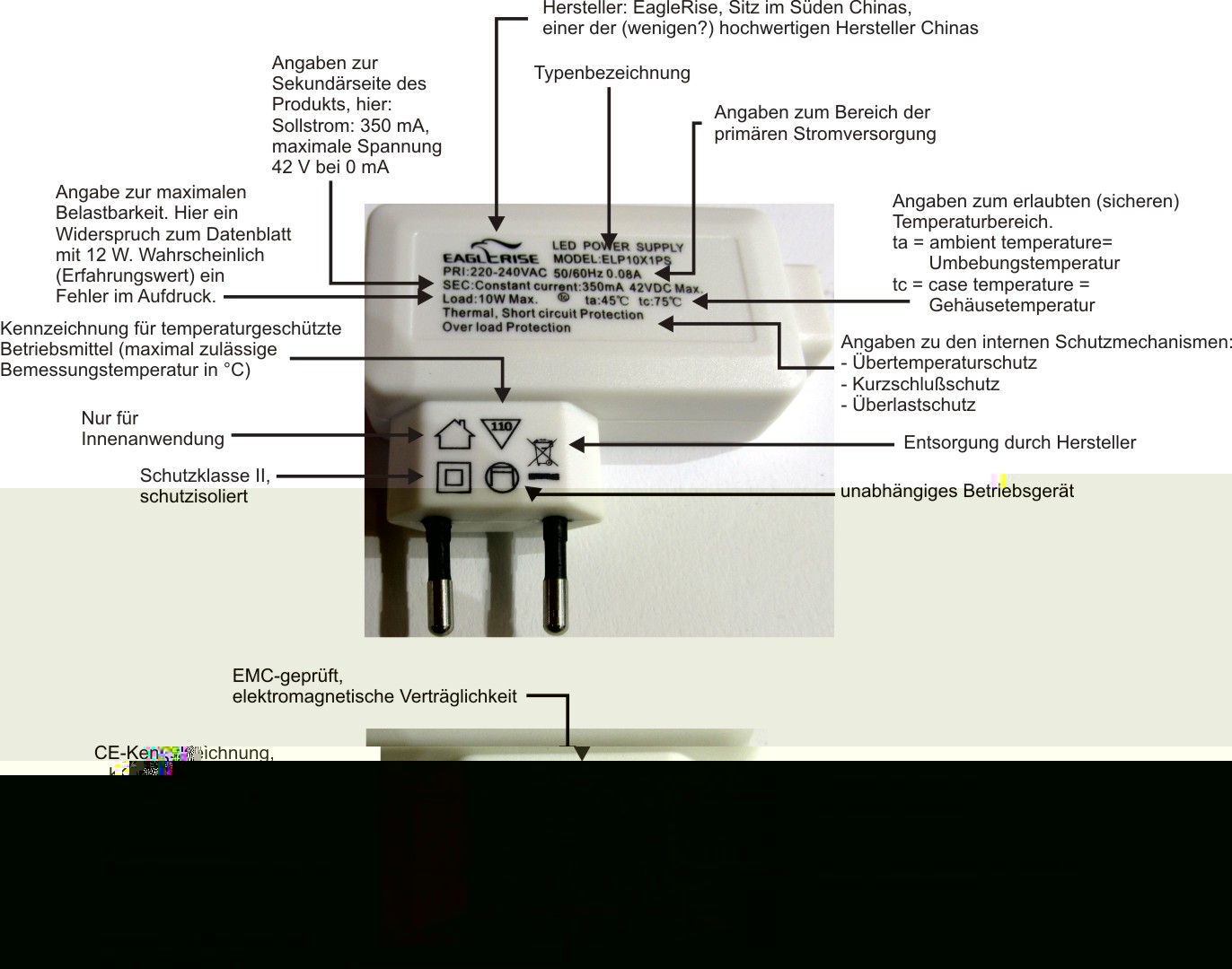Hier die Kennzeichnungen des verwendeten Steckernetzteils und deren Bedeutung: