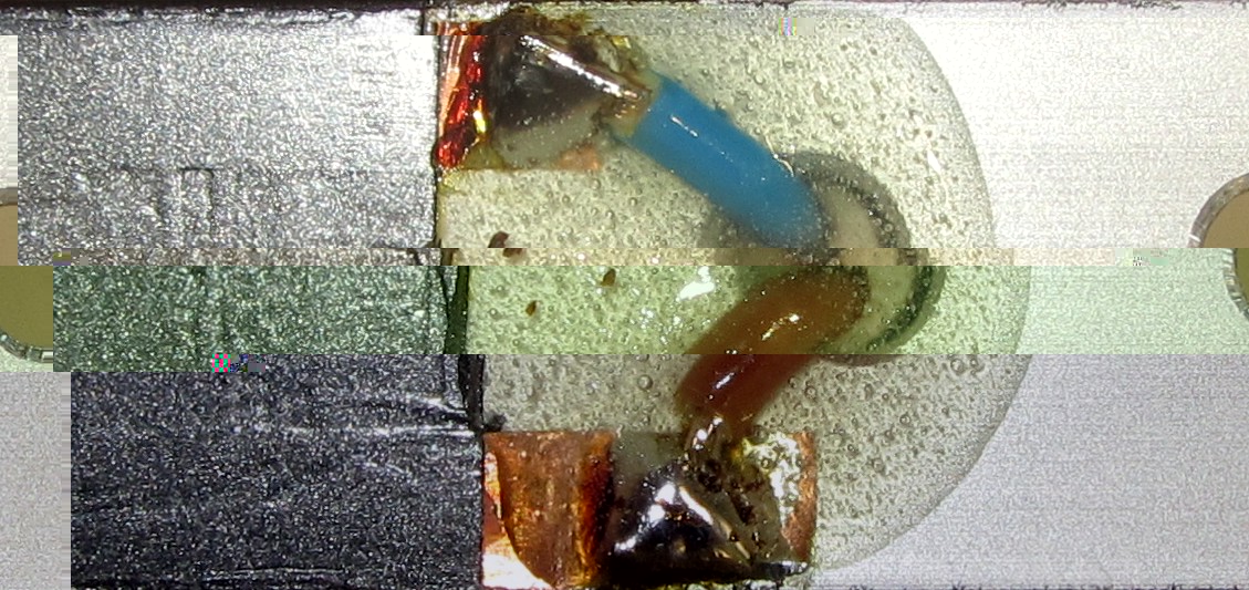 Anschließend werden die Kabelenden unter Zuhilfenahme von Flussmittel mit den Kupferstreifen verlötet. Zum Fixieren von Kabel und Lötstellen wird etwas UHU Plus endfest angerührt und über Kabeldurchführung und Lötstellen verteilt. Nach Aushärten des Klebers (ca. 12 Stunden) ist das Kabel sicher fixiert.