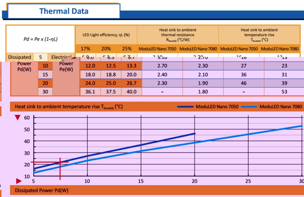 Interessant wird ein Blick ins Datenblatt des Kühlkörpers (Tabelle letzte Seite). Eine Temperaturdifferenz von 28°C entspricht einer Wärmeleistung von 4,6 W. Damit hätte das COB-Modul bei 318 mA (ca. 70% des Nennstroms) einen elektrischen Wirkungsgrad von 57%!