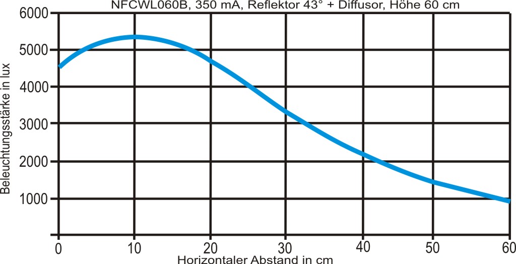 Abschließend habe ich noch die Beleuchtungsstärke auf der Tischplatte gemessen. Da die Messergebnisse bei horizontaler Lage des Sensors bei Weitem nicht dem optischen Eindruck des Helligkeitsverlaufs entsprechen, habe ich diesmal auch die vertikale Beleuchtungsstärke (Sensor senkrecht zur Tischplatte in Richtung Leuchte) gemessen und beide Werte vektoriell addiert (Pythagoras lässt grüßen). Der Nullpunkt liegt dabei 5 cm vor dem Sockel: