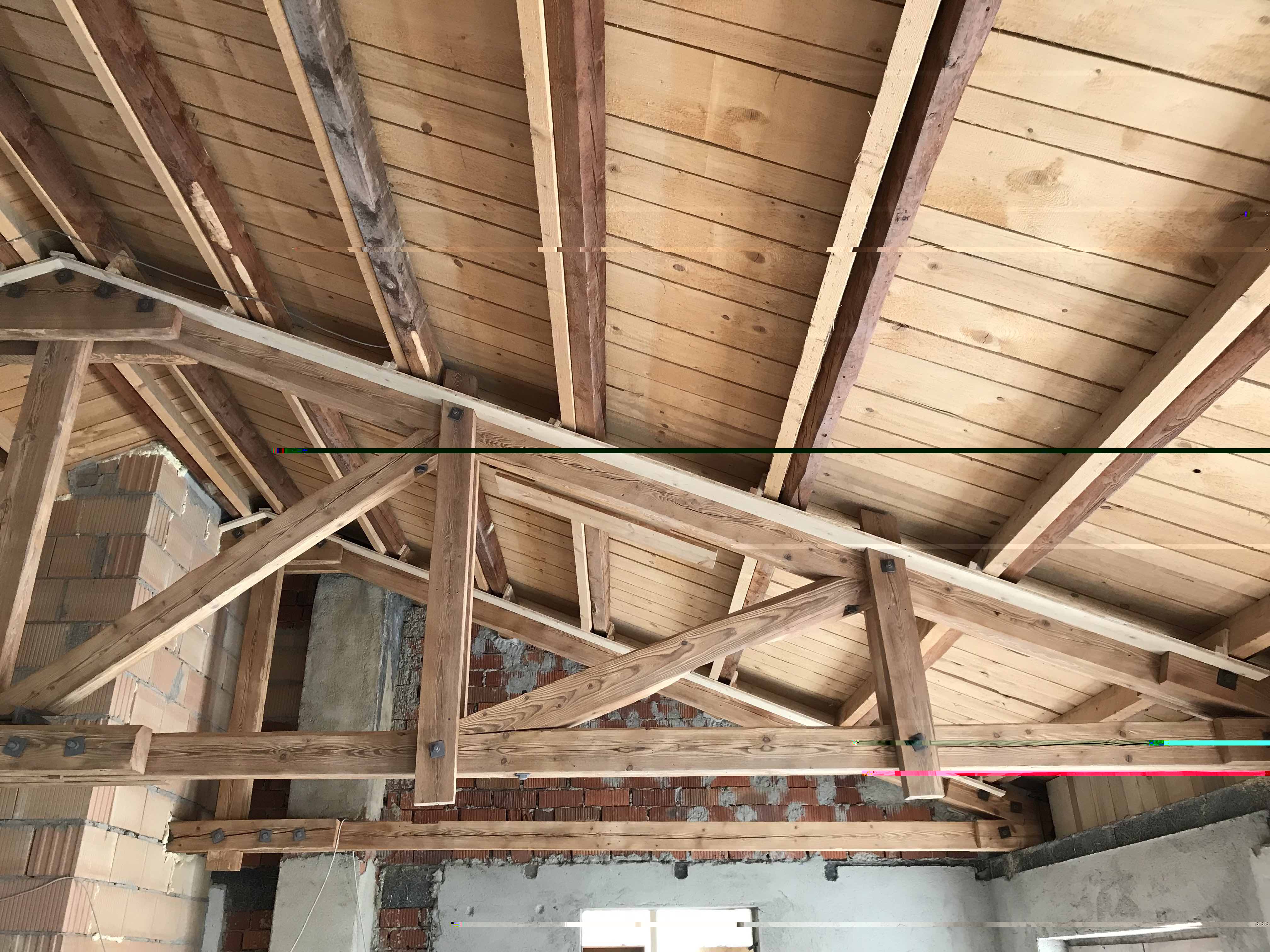 Zum Beispiel die beiden Bretter (Verbindung vom waagerechten Balken zum First).