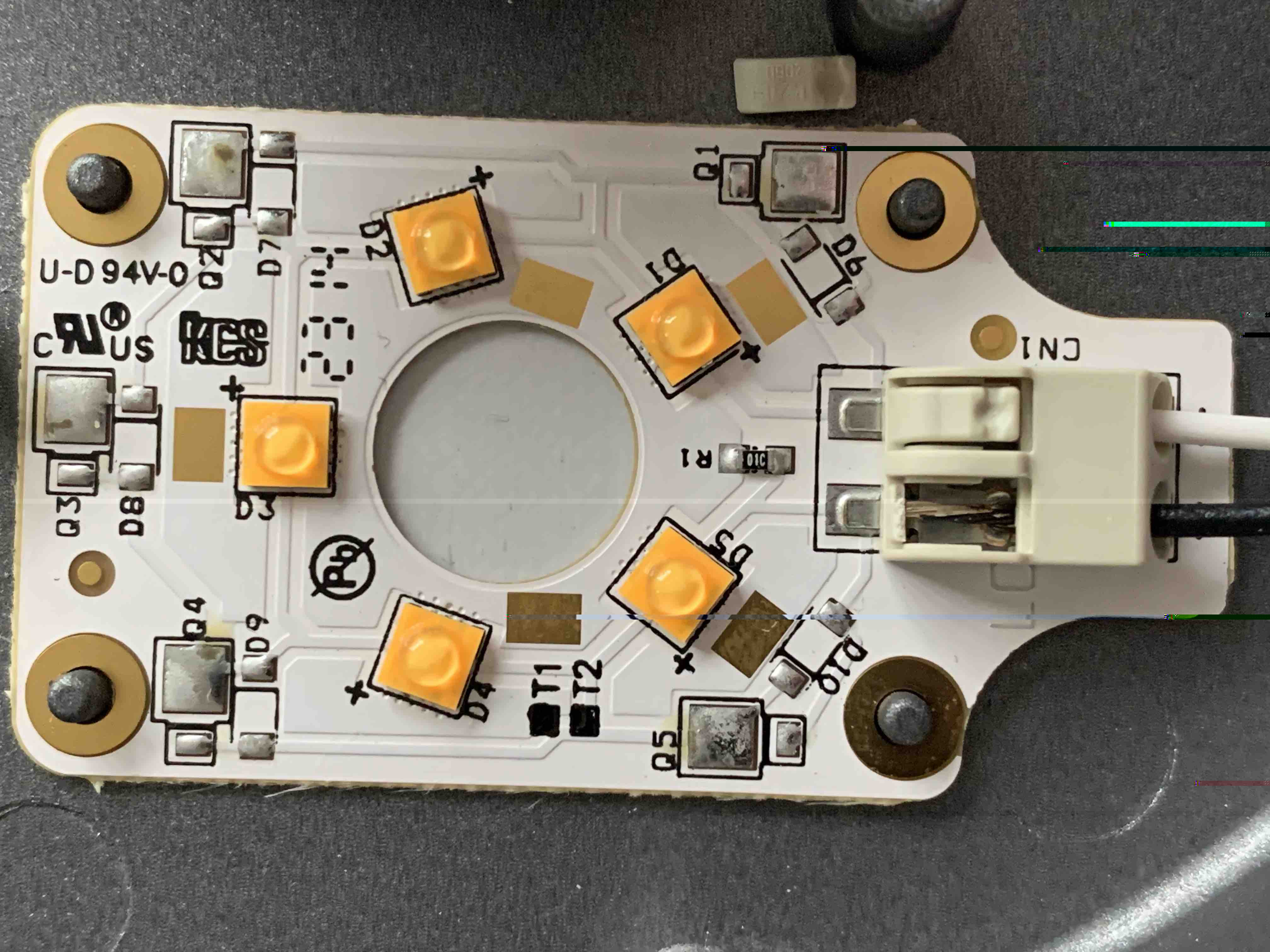 Das Problem bei der Leuchte ist, dass nur eine der fünf LEDs, die sich auf dem Chip befinden (entschuldigt bitte meine nicht-fachmännische Ausdrucksweise :D ), funktioniert. Diese lässt sich normal schalten und auch einwandfrei dimmen. Die anderen LEDs zeigen jedoch keinerlei Lebenszeichen. Äußerlich konnte ich den Komponenten keine Beschädigung ansehen, aber das heißt auch nichts.
