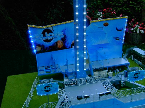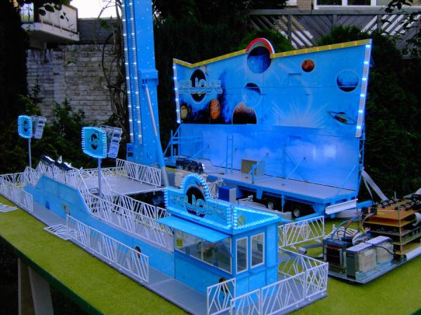 Ich würde ja ein Video mit meinem Fotoapparat machen wenn in einer Woche die Motorsteuerung fertig ist. Aber ich habe keine Ahnung wie das Video ins Forum gepostet wird. Schreibt mir mal ein paar Tips dann wird es schon klappen.Der Propeller ist auch am Originalgeschäft nur eine Atrappe. Er hat mit dem Antrieb nichts zu tun. Der Antrieb sitzt am Ende der Säule wo auch die Schleifringe für die Stromübertragung sitzen. Auf einem Bild kann man das sehen.Zur Zeit baue ich die Motorsteuerung und dann ist das Modell fertig. Das Modell ist sehr schwer weil am Ende des rotierenden Armes alles mit Blei als Kontergewicht gefüllt ist. Sonst würde sich der Arm niemals drehen. Am 6.7. in Düren ist das keine Modellbauausstellung. Dort im Stadtcenter habe ich dann meine komplette Kirmes aufgebaut. Die Ausstellung ist 21 Quatratmeter groß und wird über Schaltuhren gesteuert. Ich bin nur beim Auf und Abbau da.